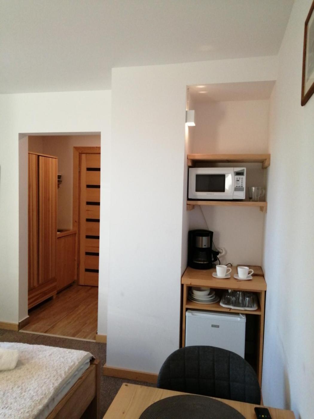 Studio. The studio features a seating area, a dining area, as well as a private bathroom featuring a shower and a hairdryer. The kitchenette is equipped with a stovetop, a refrigerator and kitchenware. The studio provides a flat-screen TV with satellite channels, a private entrance, soundproof walls, a tea and coffee maker as well as garden views. The unit offers 1 bed. Studio - 2 osobowy. Powierzchnia pokoju ok.: 30 mkw.